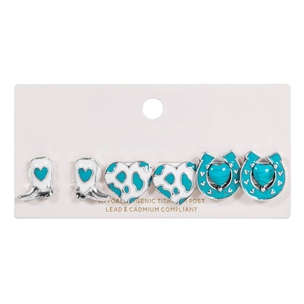 3Pairs - Western Heart Boot Horseshoe Stud Earring Set
