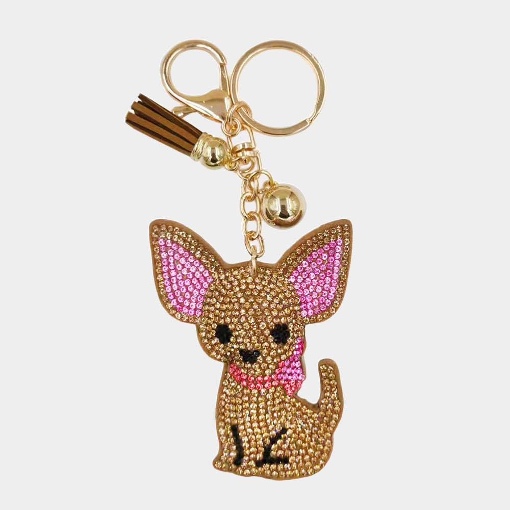 Adorable dog-shaped keychain covered in shimmering rhinestones with tassel and gold hardware. Adds personality to keys, purses, or backpacks. Great gift for dog moms, pet lovers, and boutique shoppers.