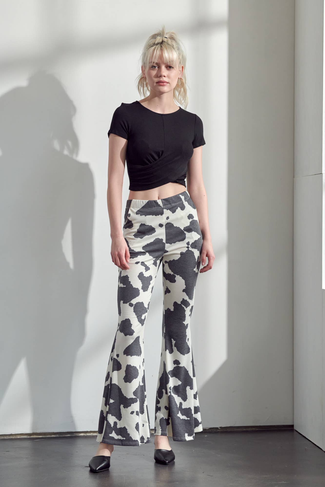 The "Cow Print Flared Pants" are a best-selling and must-have item for those who love to infuse their wardrobe with a touch of western flair. These pants feature a striking cow print, perfect for making a bold fashion statement. The bell-bottom style adds a retro and trendy touch, making them a standout piece.