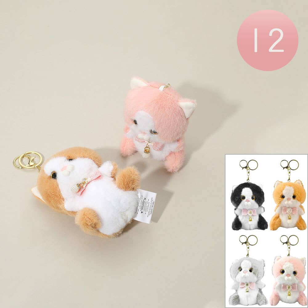 Adorable plush cat keychain featuring a soft texture, elegant bow, and tiny bell charm. Perfect for accessorizing bags, keys, or backpacks, this cute feline design adds charm and personality. Makes a delightful gift for animal lovers and plush toy collectors.