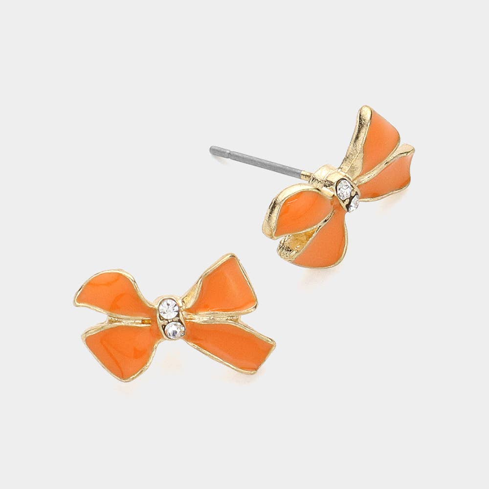 These enamel bow stud earrings offer a sweet and playful touch with their glossy orange finish and delicate gold-tone trim. A small crystal center adds a hint of sparkle, making them perfect for adding charm to everyday outfits or gifting with a cheerful twist.