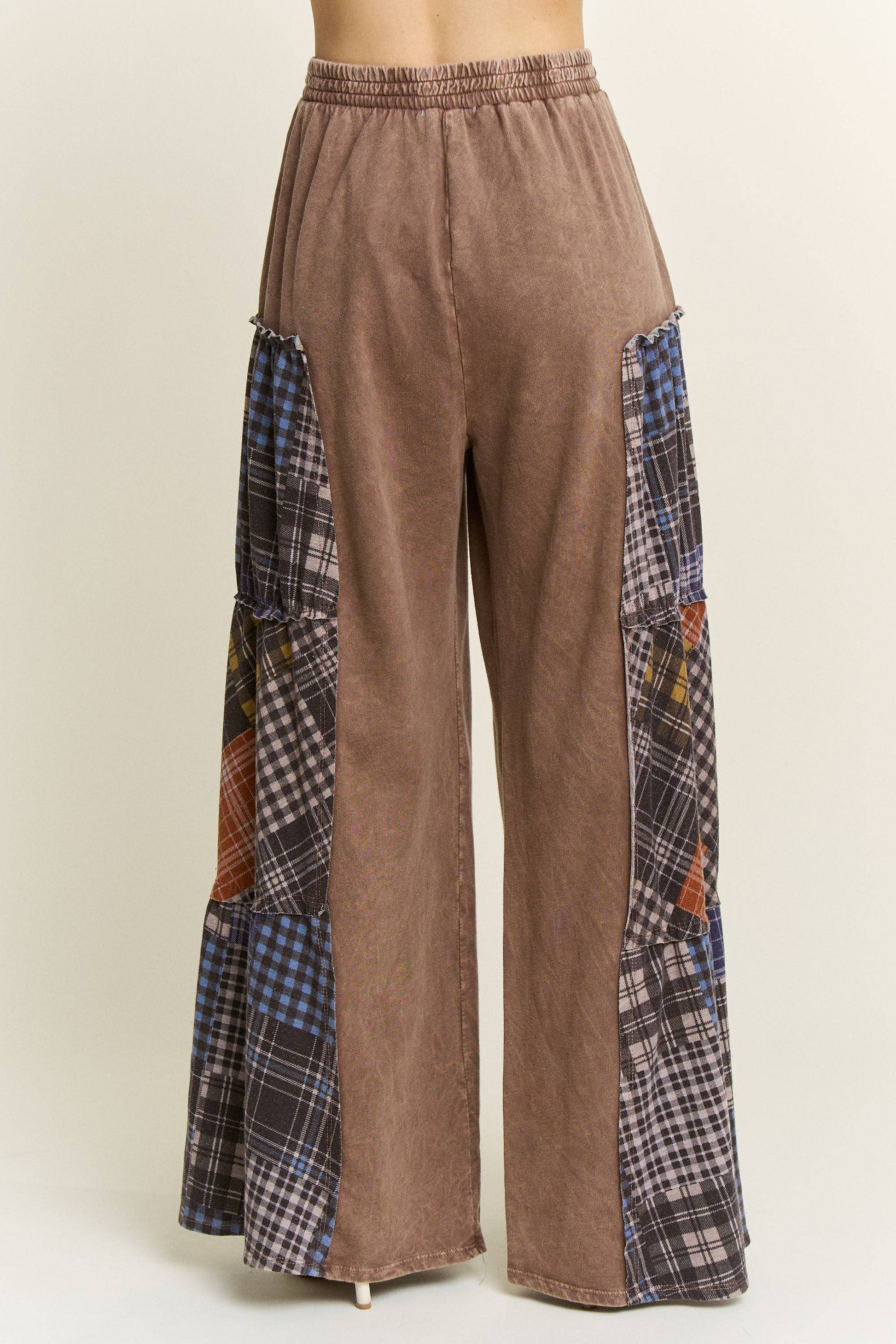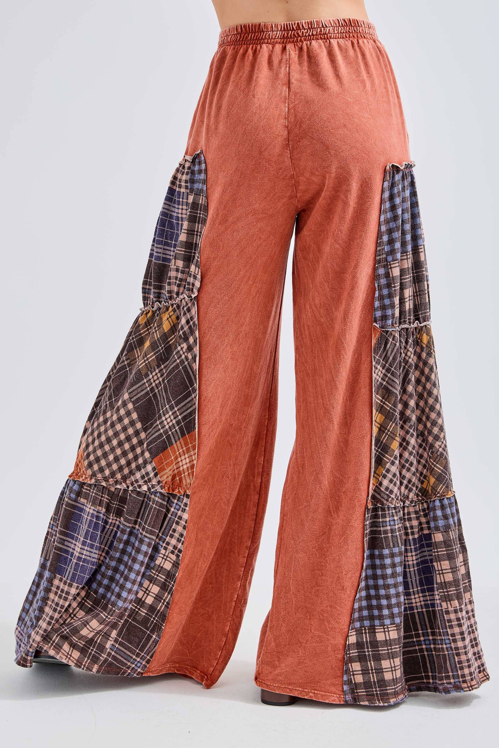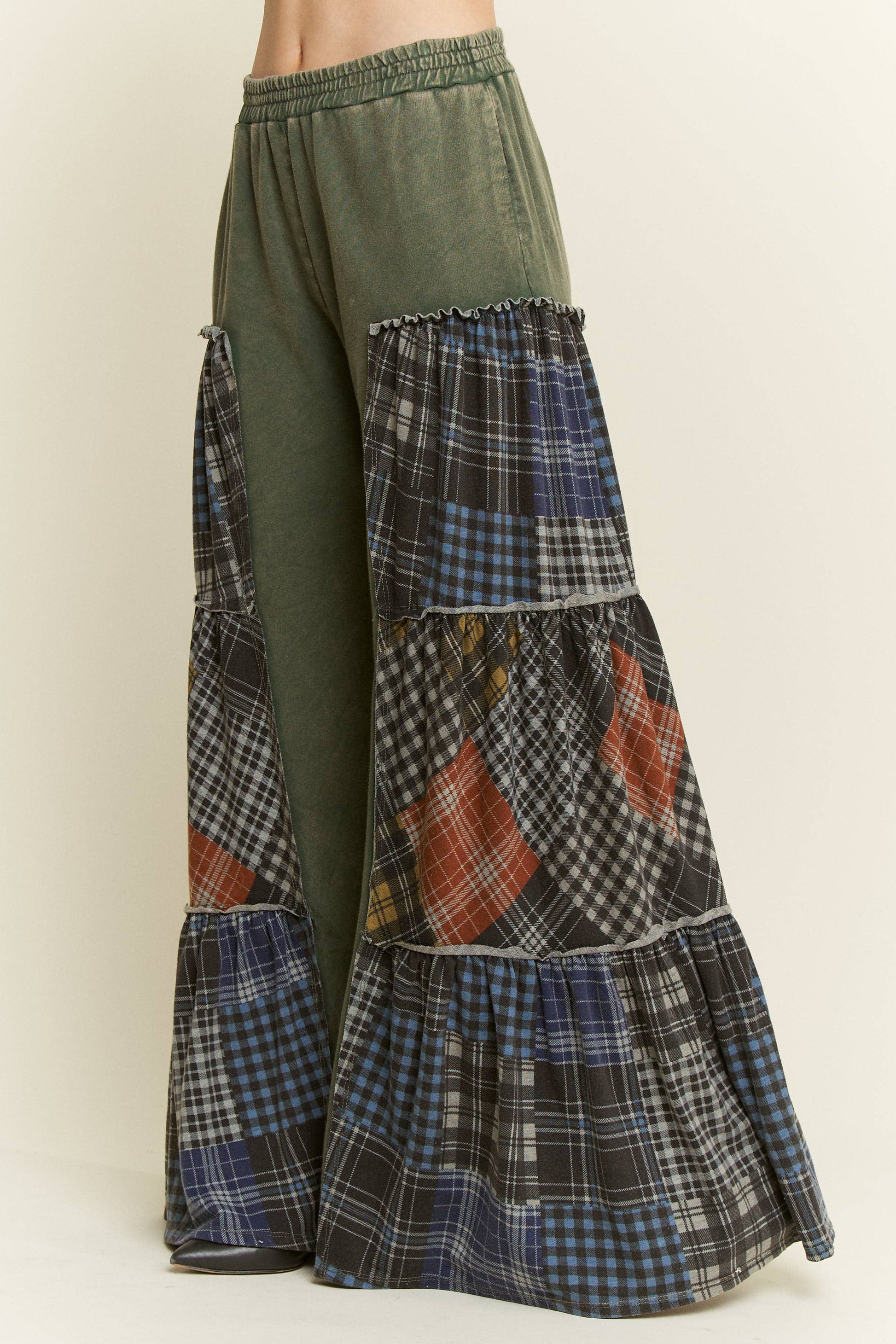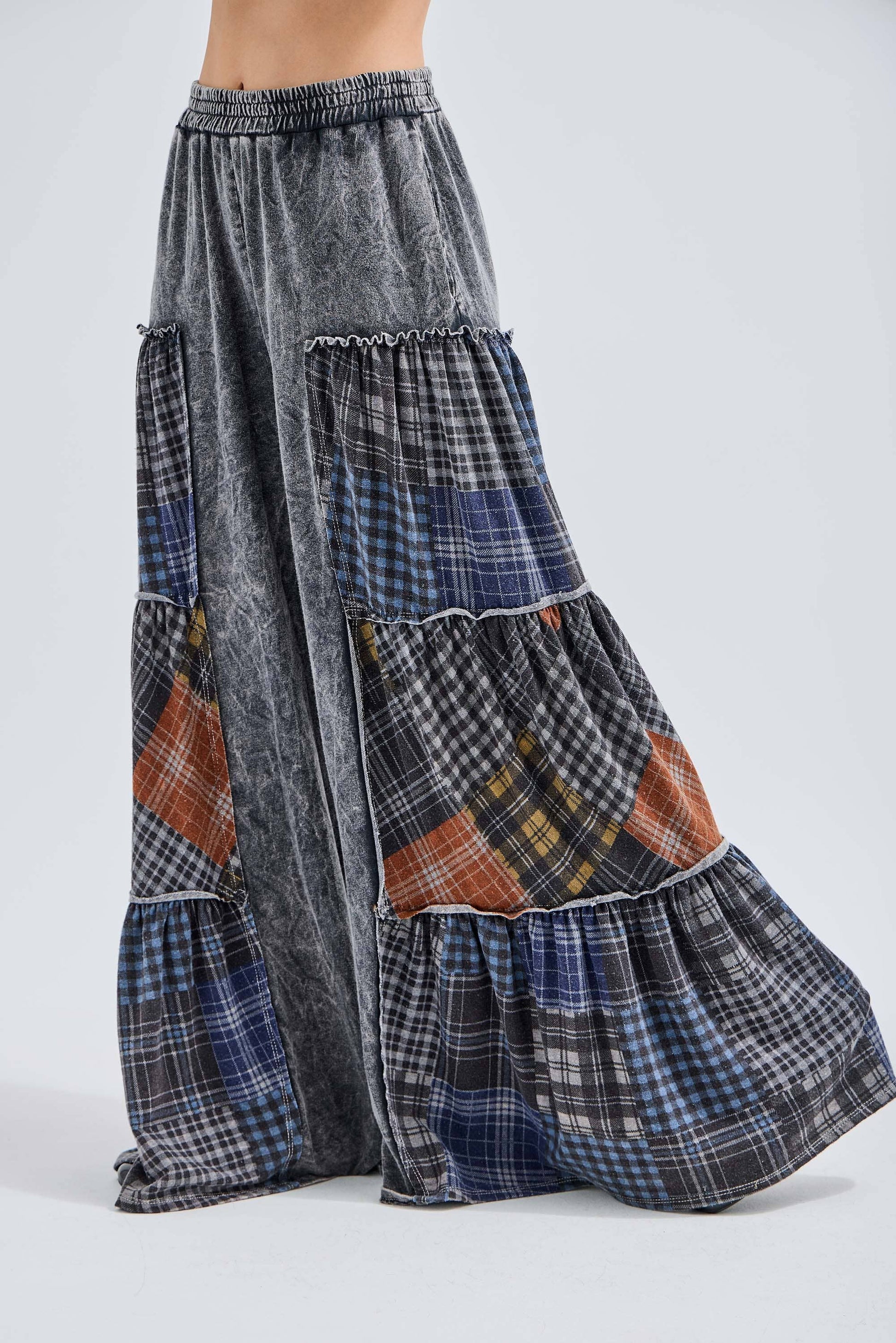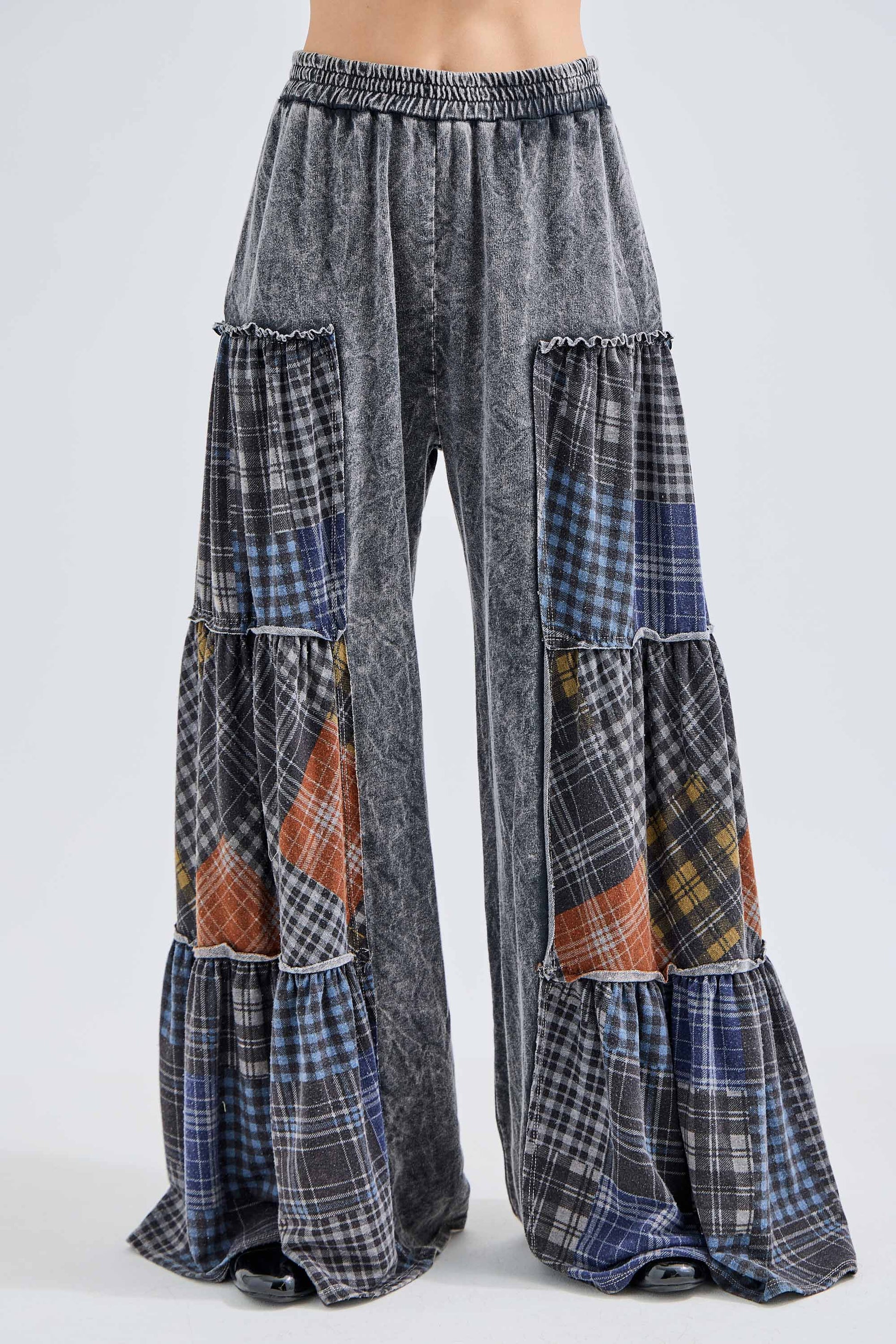 Mineral Washed Boho Tiered Plaid pattern Wide Flare pants