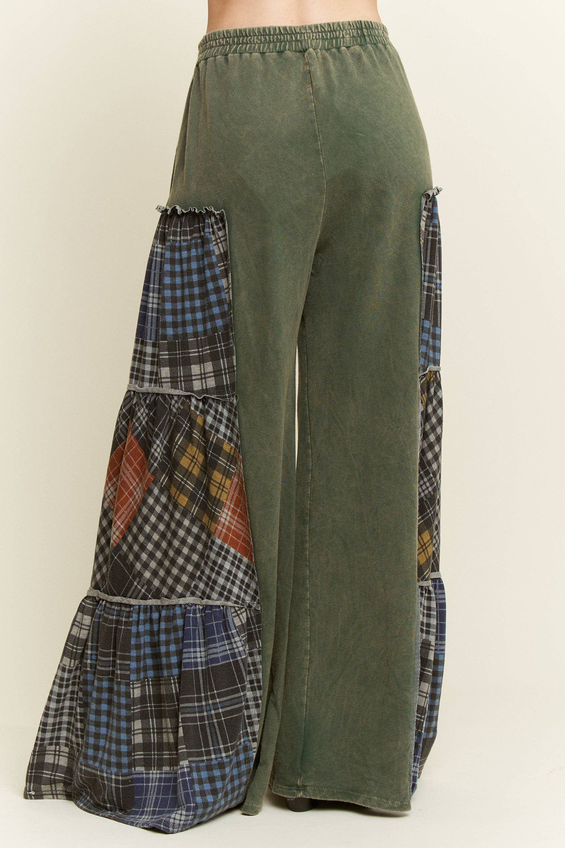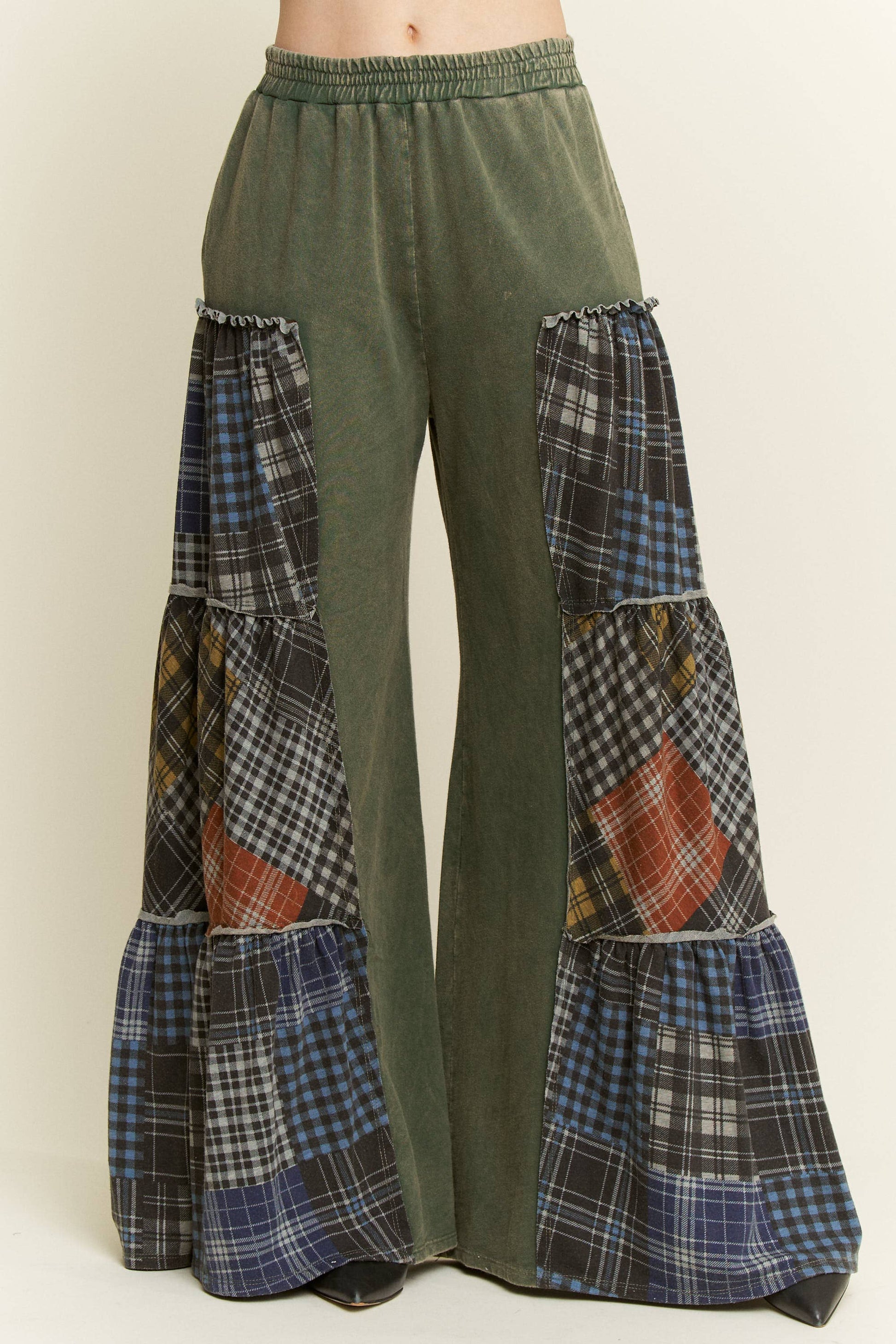 Mineral Washed Tiered Plaid Wide Flare pants HP6675: Olive / S-M-L / 2-2-2