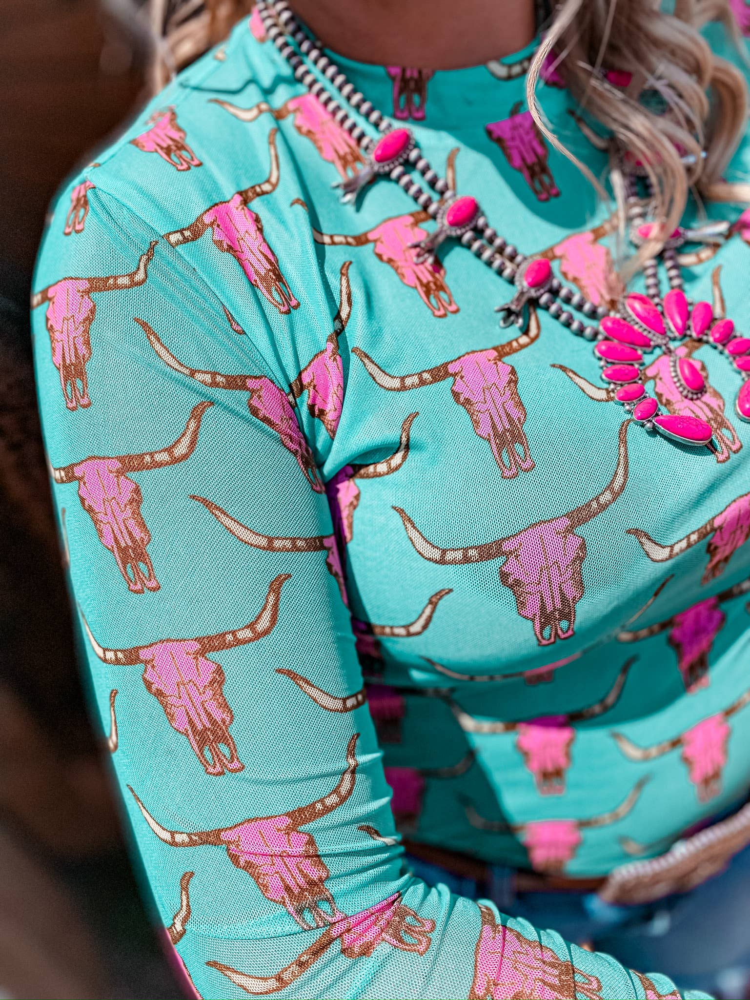 Pass this cute chick dressed to the nines and looking fine on her way to the concession stand! This design will have 'em all asking, "Heifer, where'd you get that top?!" If turquoise and mint green had a cute cousin... that's the background shade of this long sleeve mesh top that is accented with bubblegum pink cow skulls. Grab our own MK210 Pink Cadillac Corduroy Shacket and you've got yourself a 2 item sale!