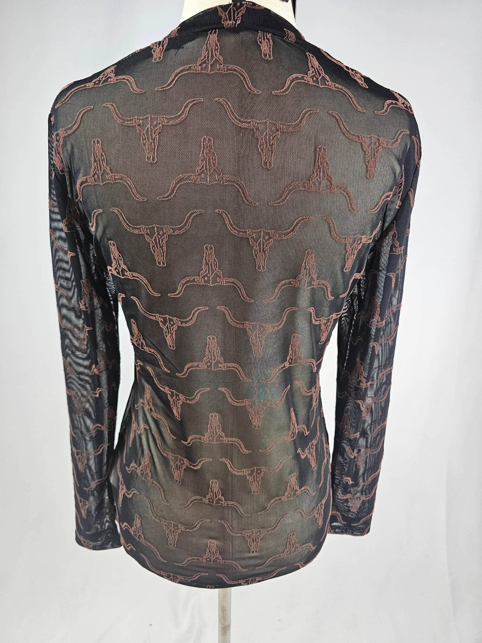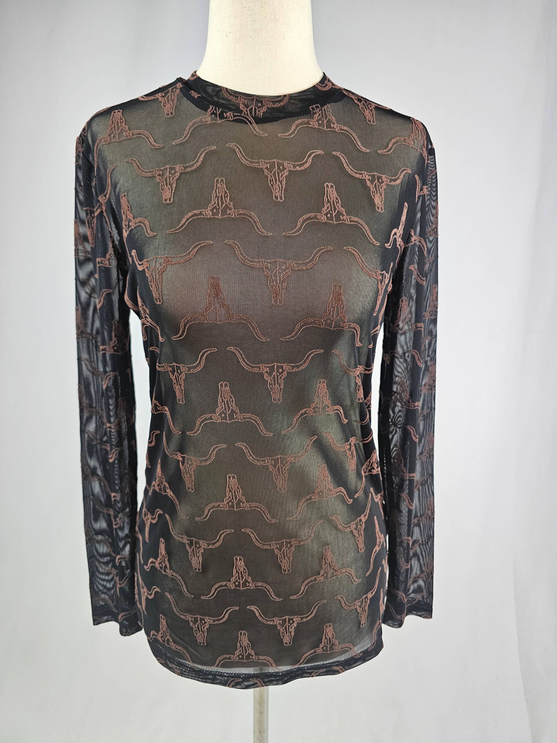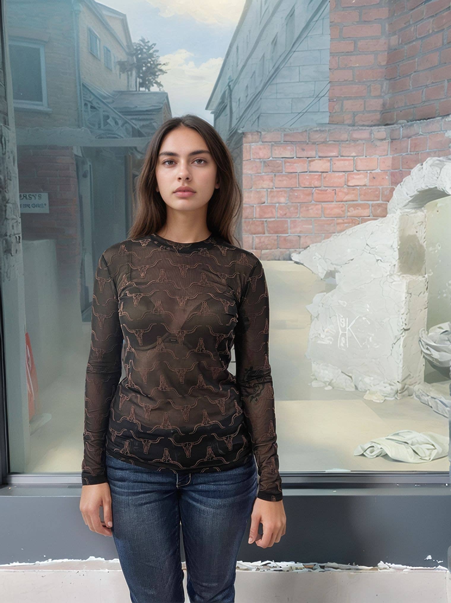 Introducing the MK396 3D Printed Longhorn Mesh Top in Black, a standout piece from Merigold Kiss's collection. This top, crafted with a unique 3D printed Longhorn design on a mesh fabric, is a modern twist on traditional western-inspired fashion. Its long sleeves make it versatile for all seasons.