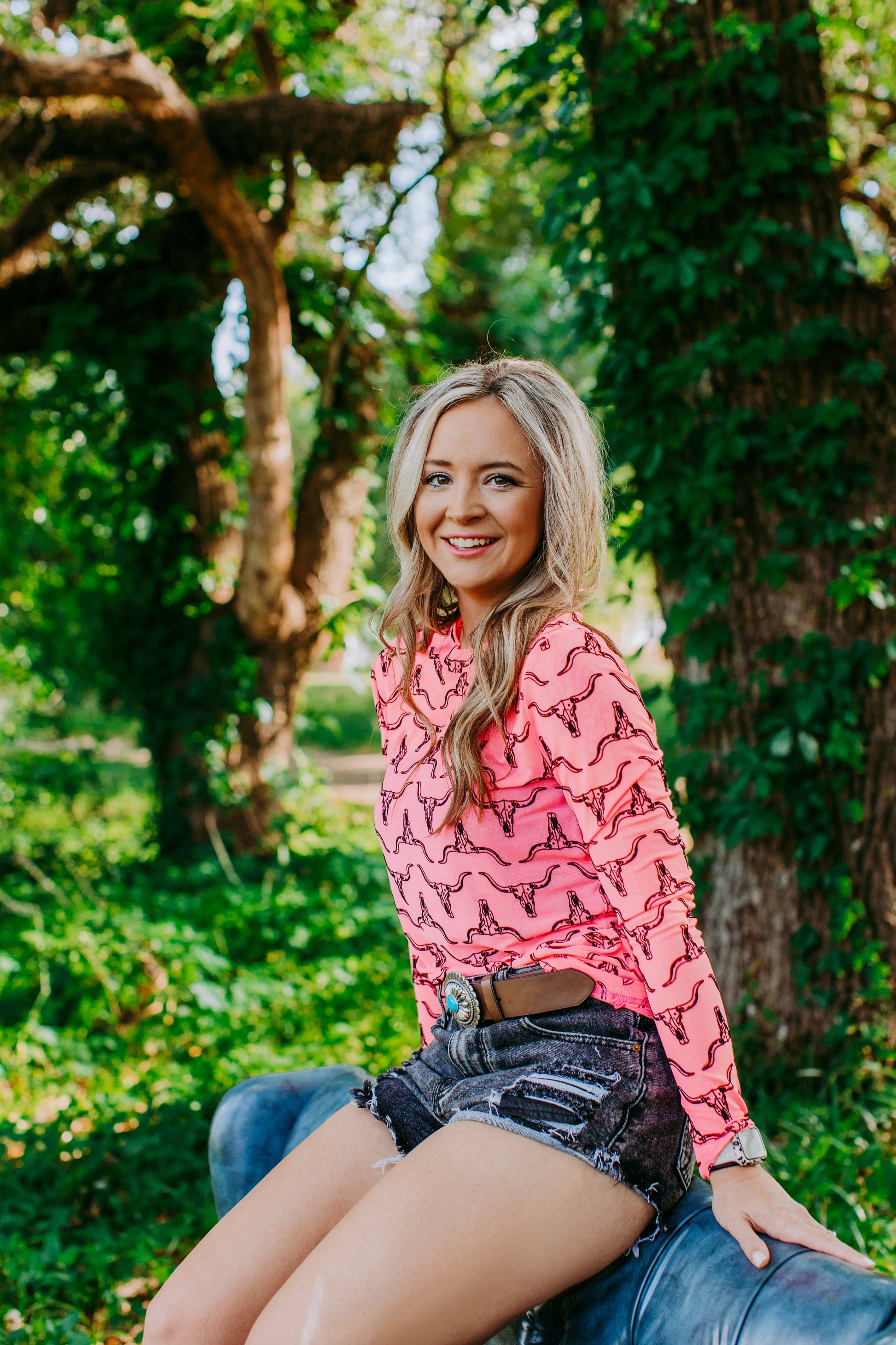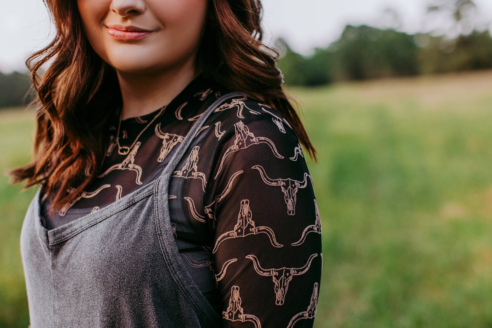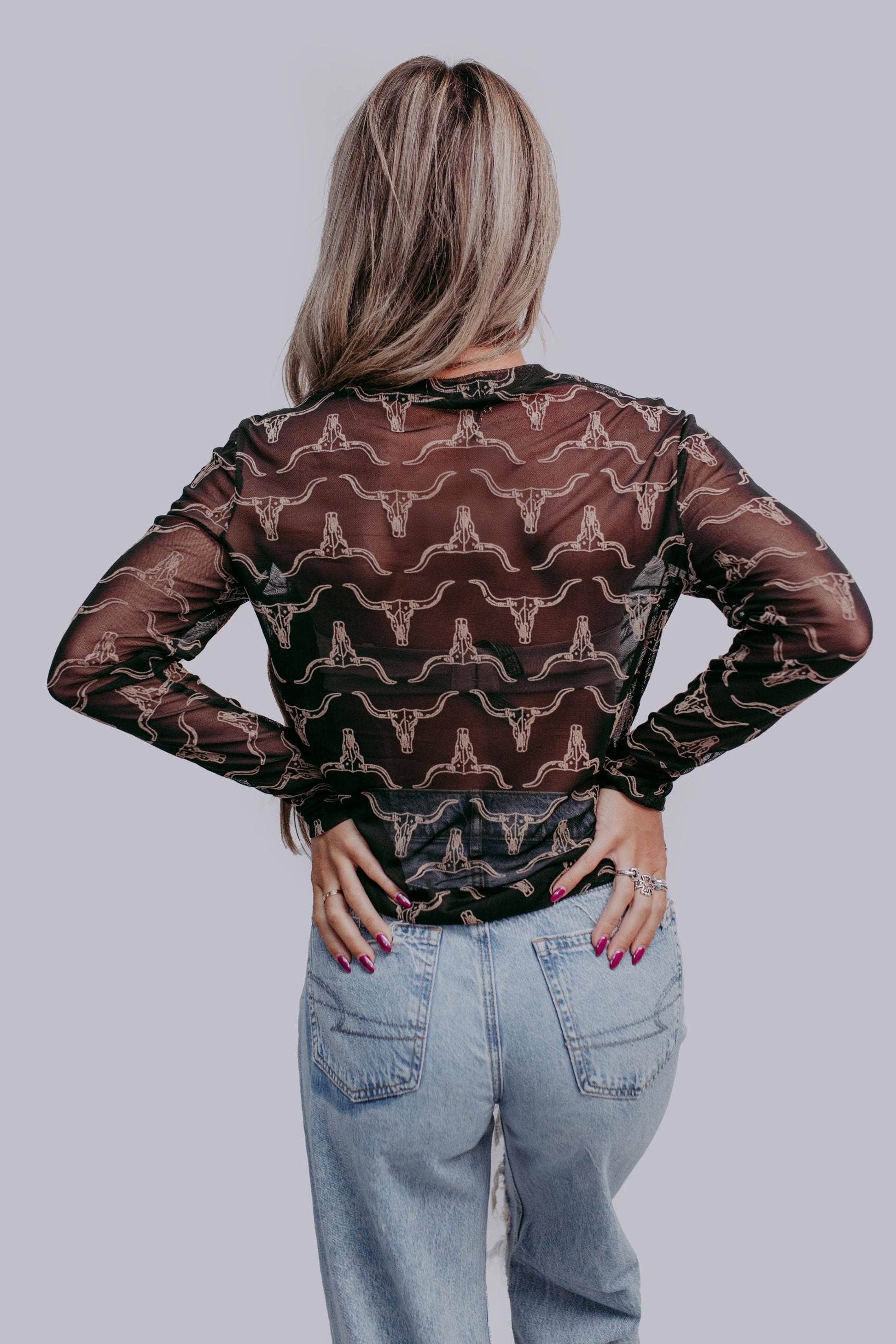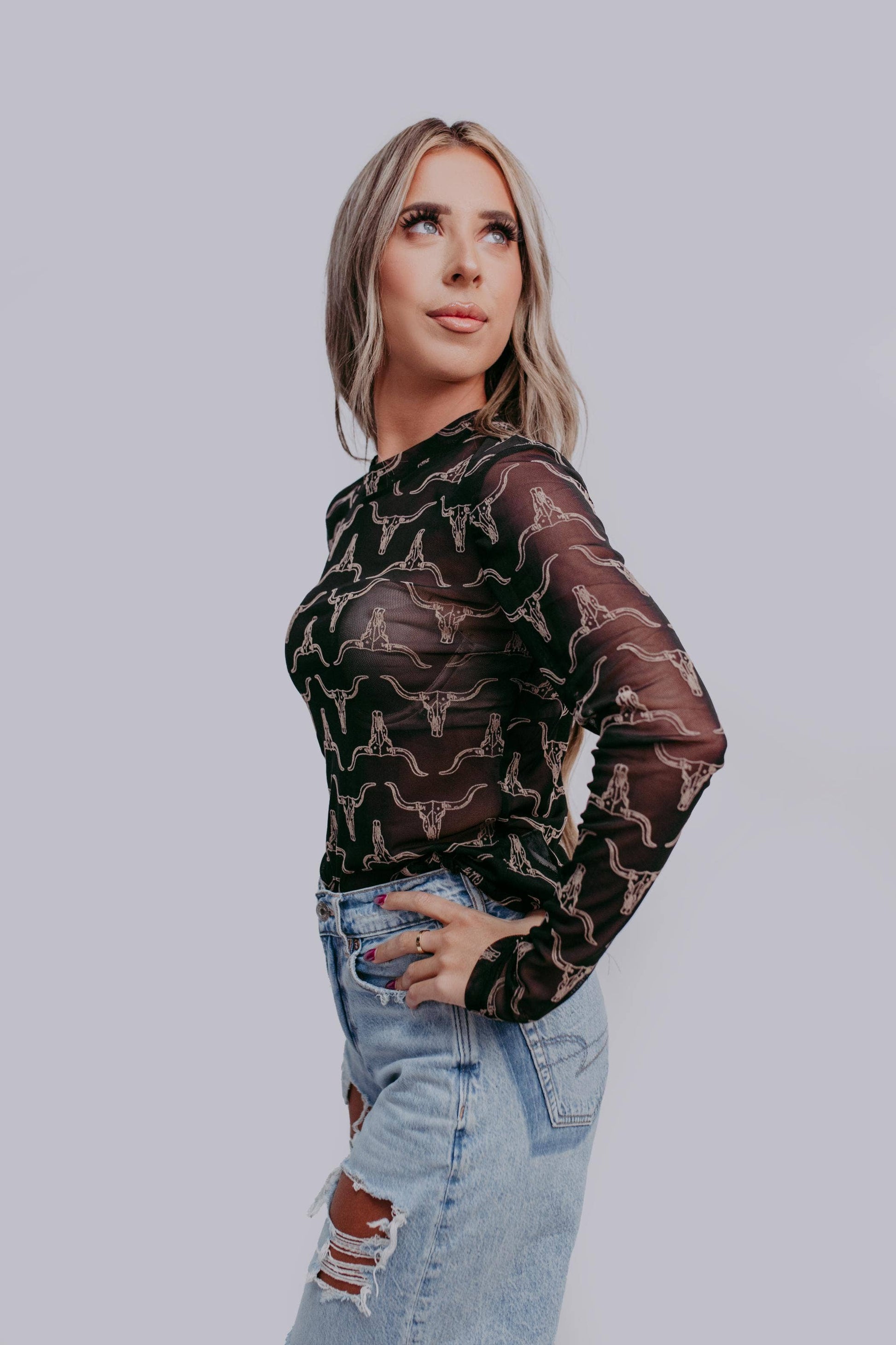 Introducing the MK396 3D Printed Longhorn Mesh Top in Black, a standout piece from Merigold Kiss's collection. This top, crafted with a unique 3D printed Longhorn design on a mesh fabric, is a modern twist on traditional western-inspired fashion. Its long sleeves make it versatile for all seasons.