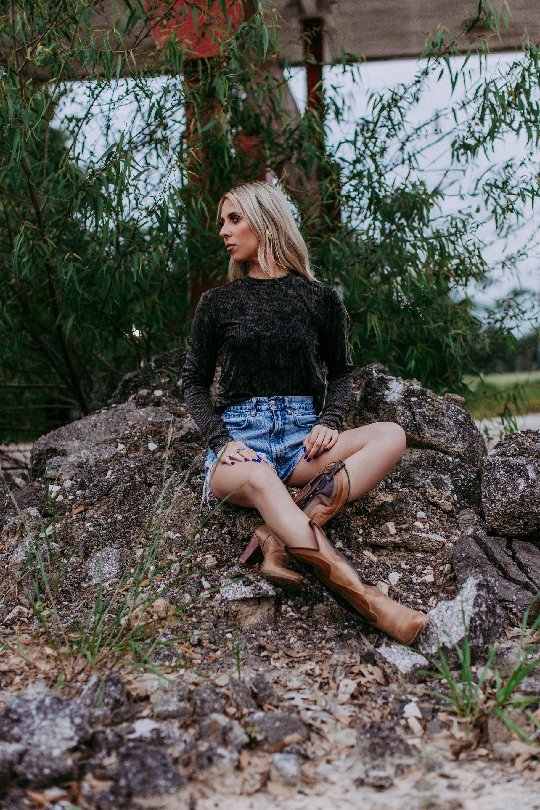 MK412 Acid Washed Ribbed LS Mock neck Top - Charcoal