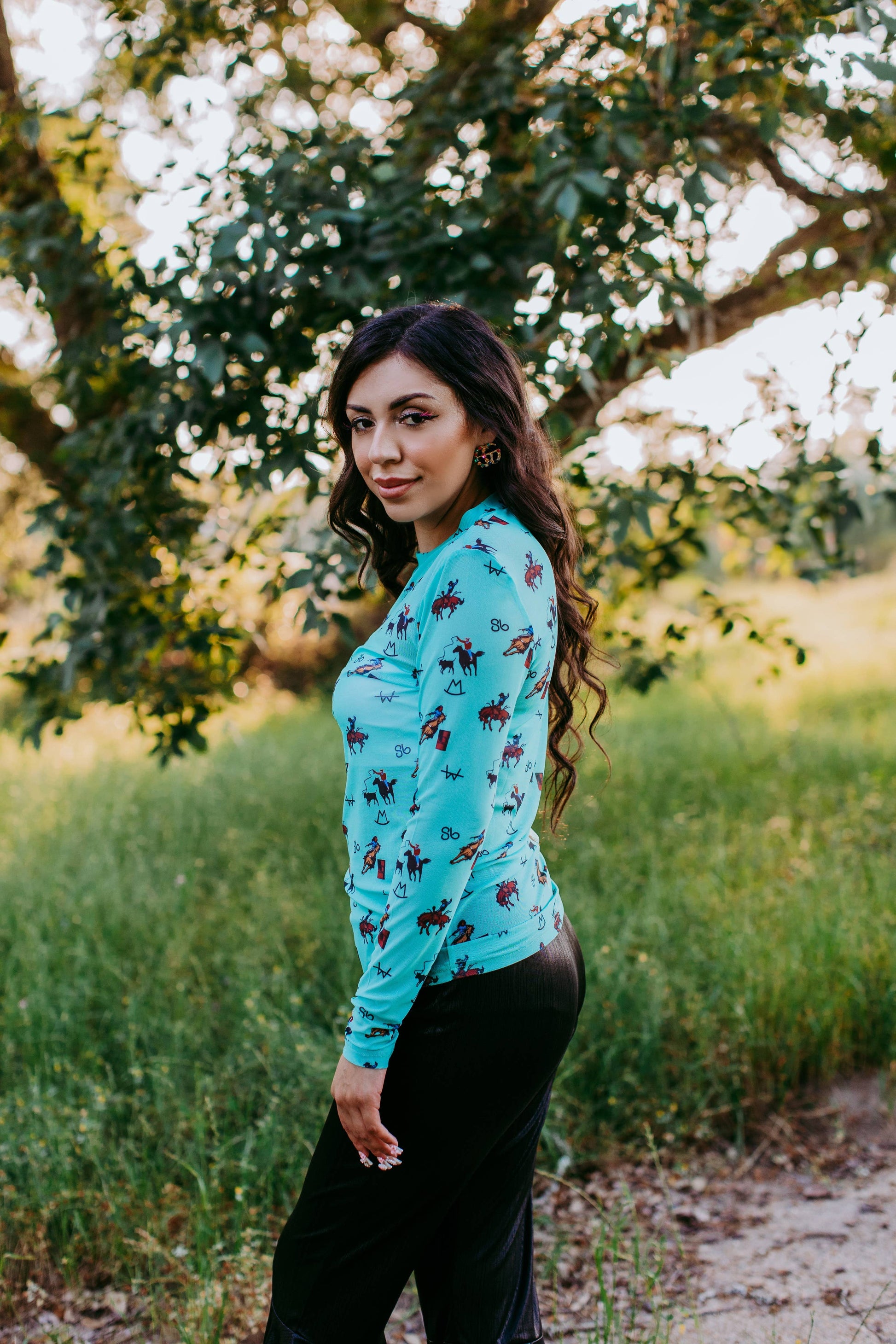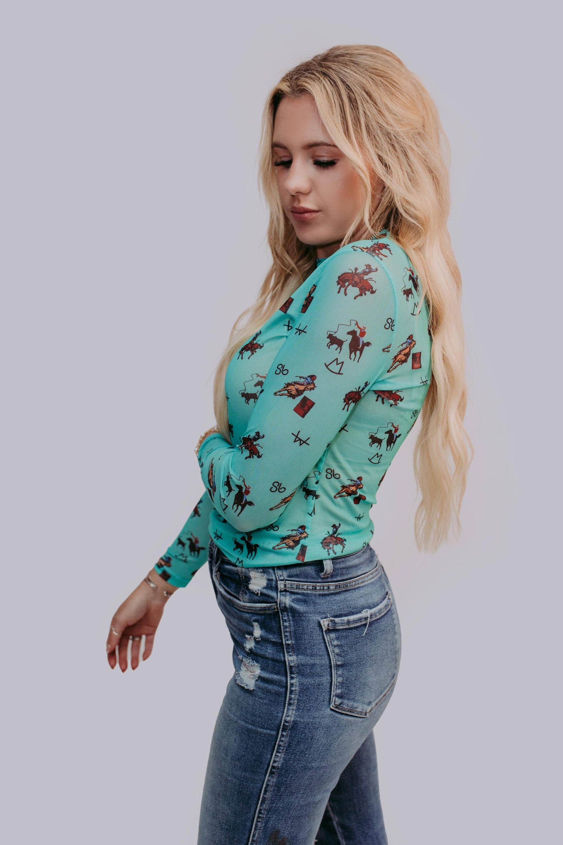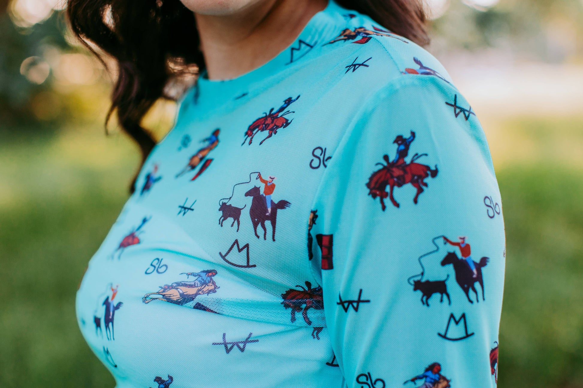 Introducing the MK462 Branded LS Mesh Top from Merigold Kiss. This turquoise long sleeve top is a unique addition to any wardrobe. As a product of a family-owned Texas-based brand, expect quality and style.