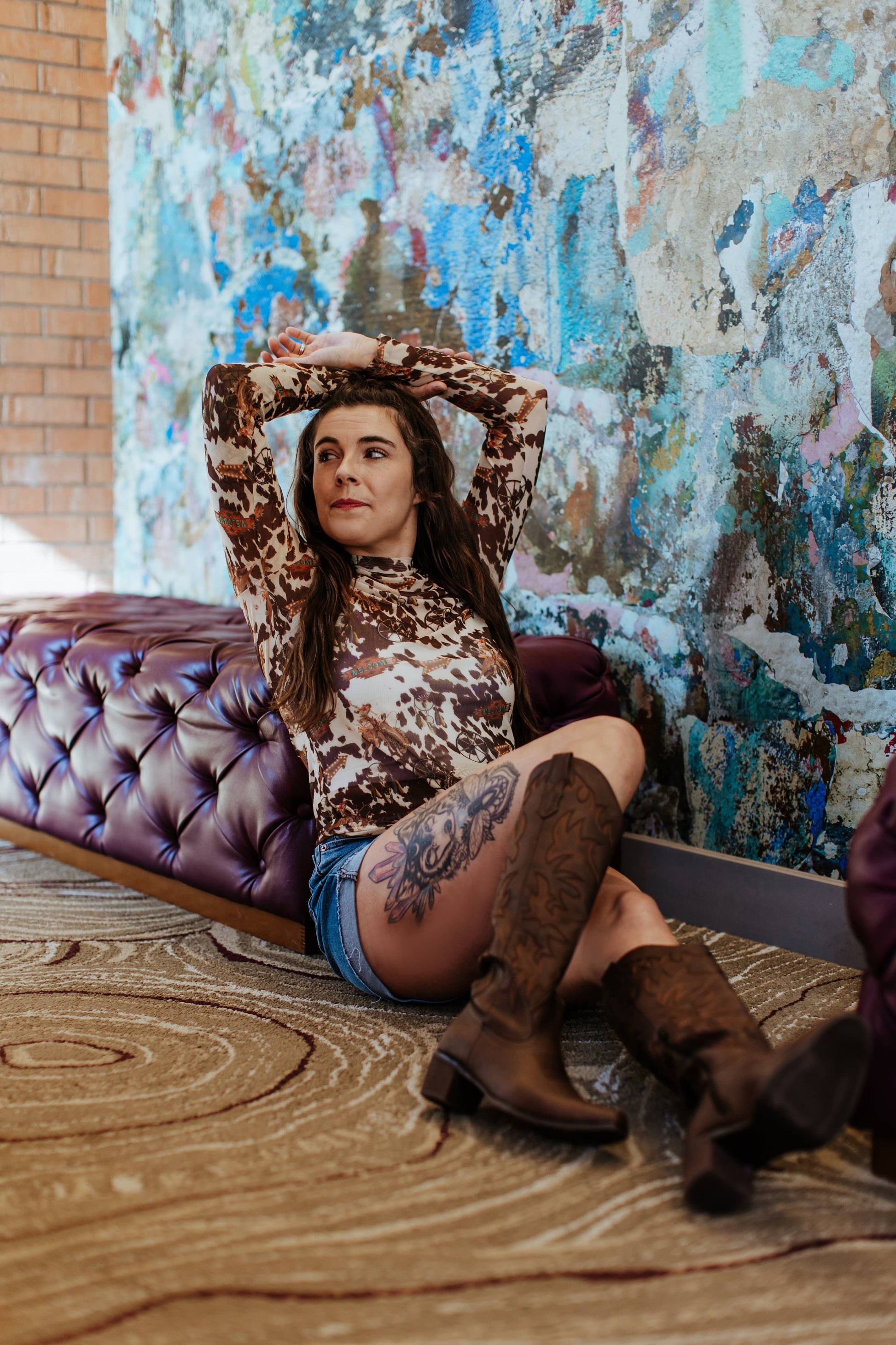 This trendy stretchy mesh fabric is the perfect fit for this coming Fall. Welcome this buckin' horse cowhide pattern. Long sleeves which makes it suitable for cooler weather while maintaining a stylish appeal!