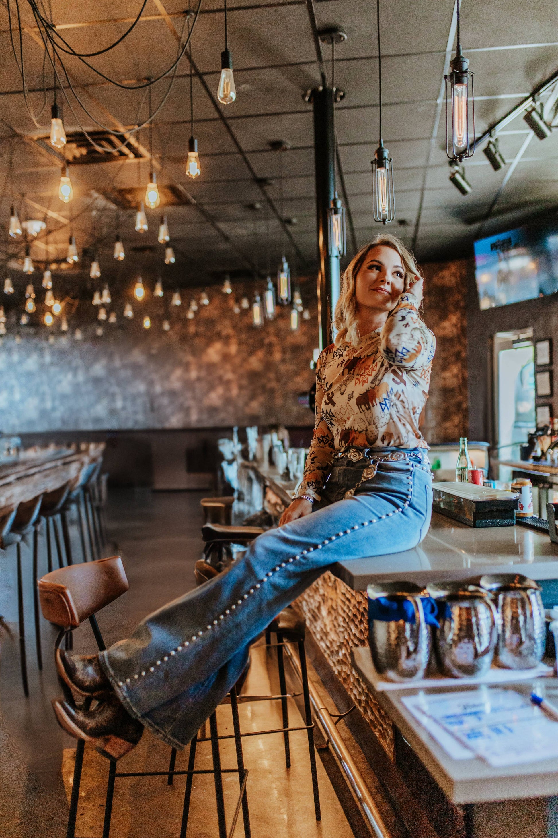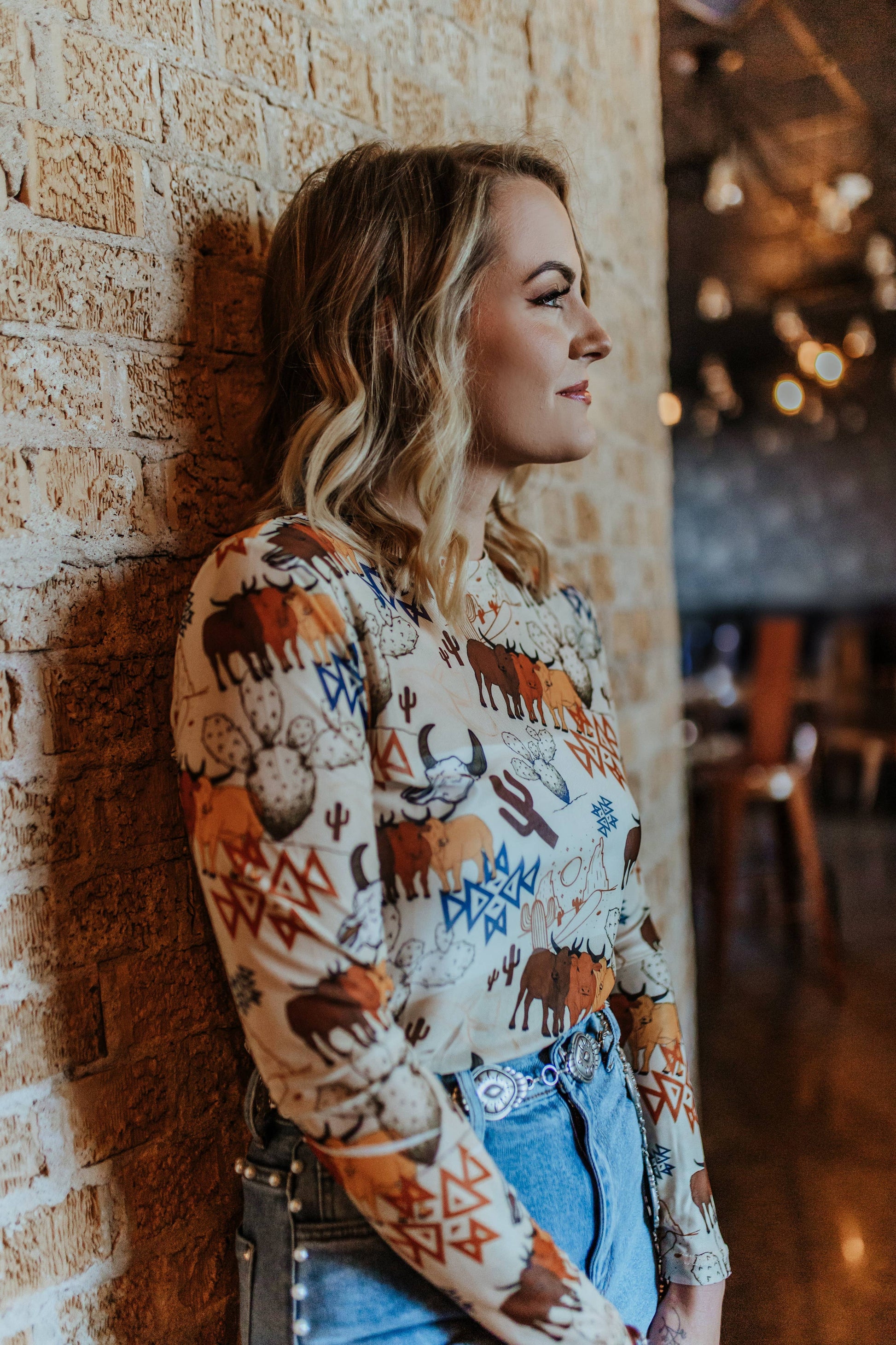 This neutral color mesh gives country western a new look. This mesh features longhorns and an Aztec design over a desert scene. Close-fitting mesh hugs every curve in this vividly printed crewneck top.