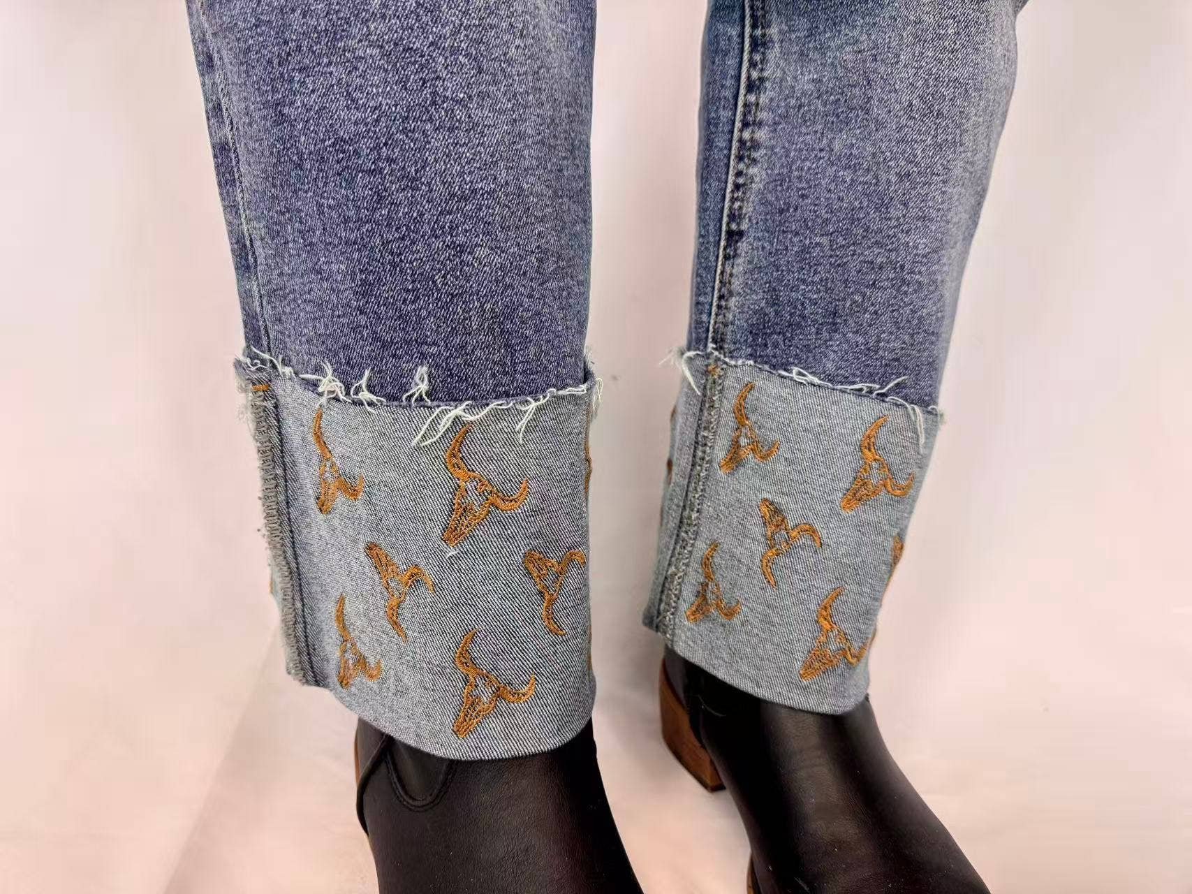 Classic denim with a western twist - these jeans feature a relaxed straight-leg fit and bold, wide cuffs embroidered with longhorn skulls. The distressed details and raw hem add a rugged edge, while the high-rise waist and traditional 5-pocket design keep them timeless and versatile. Perfect for dressing up with boots or keeping casual with sneakers, these jeans bring standout western style to any outfit.