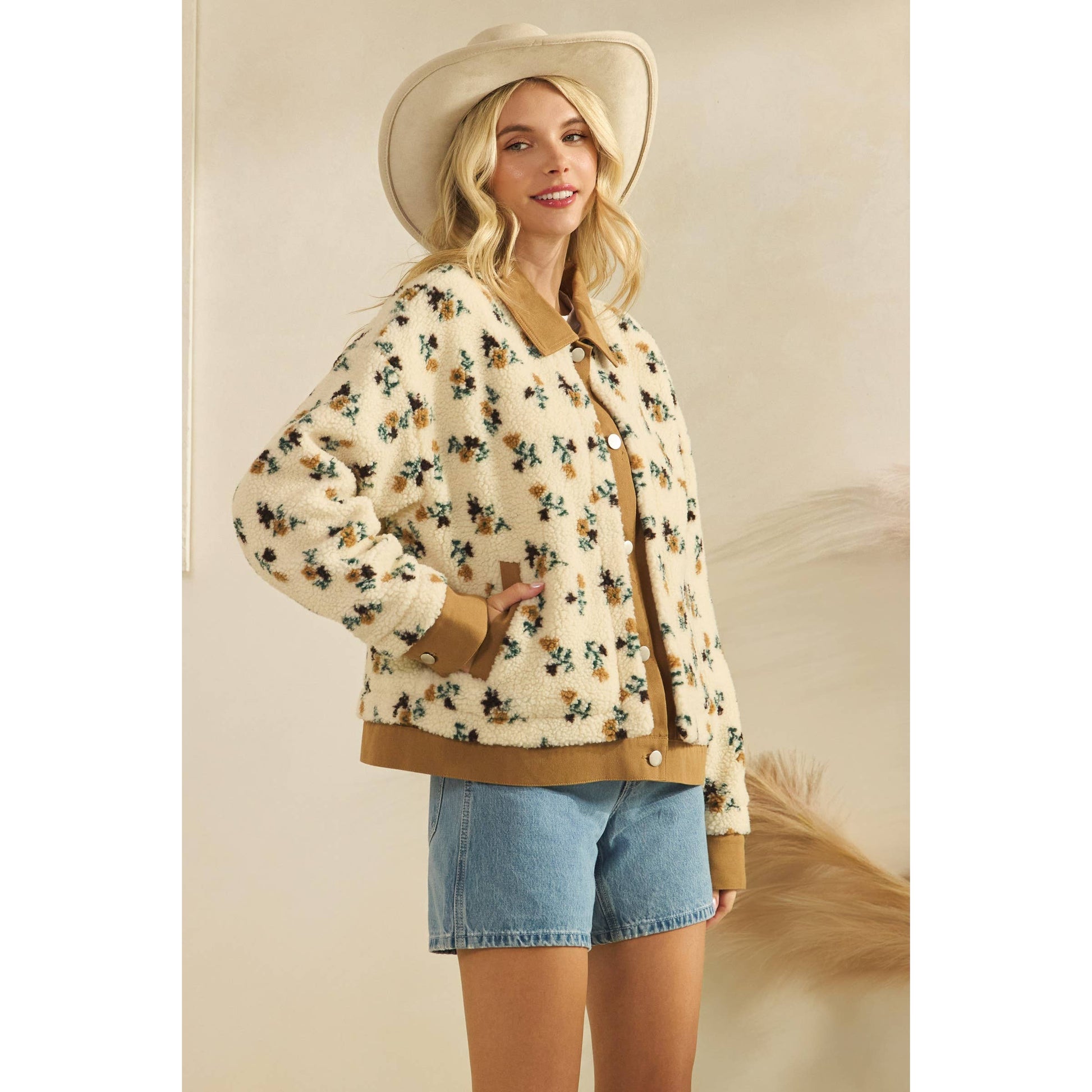 Printed Contrast Button Down Sweater: Brown / S