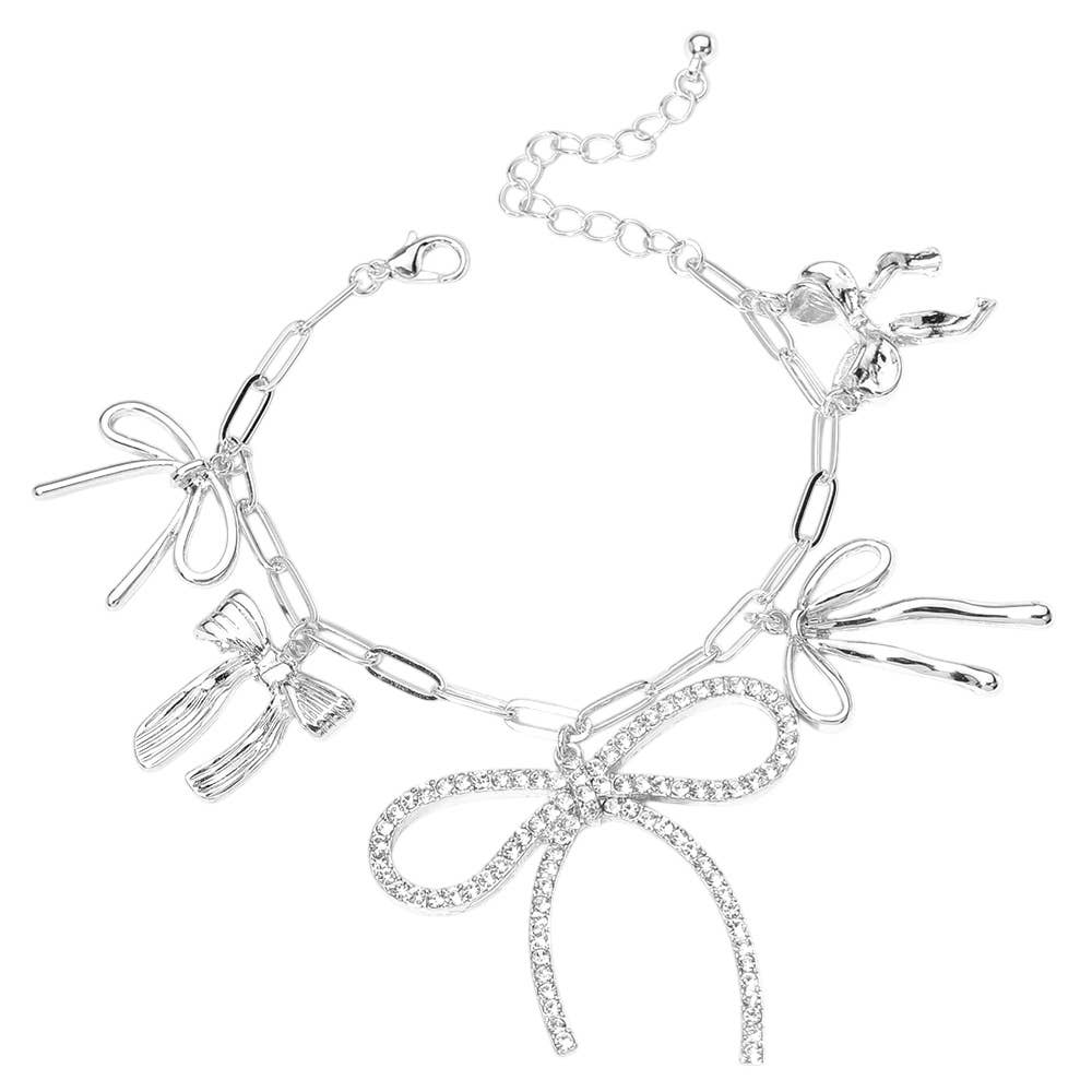 Stone Paved Bow Metal Bow Charm Station Paperclip Chain Bracelet