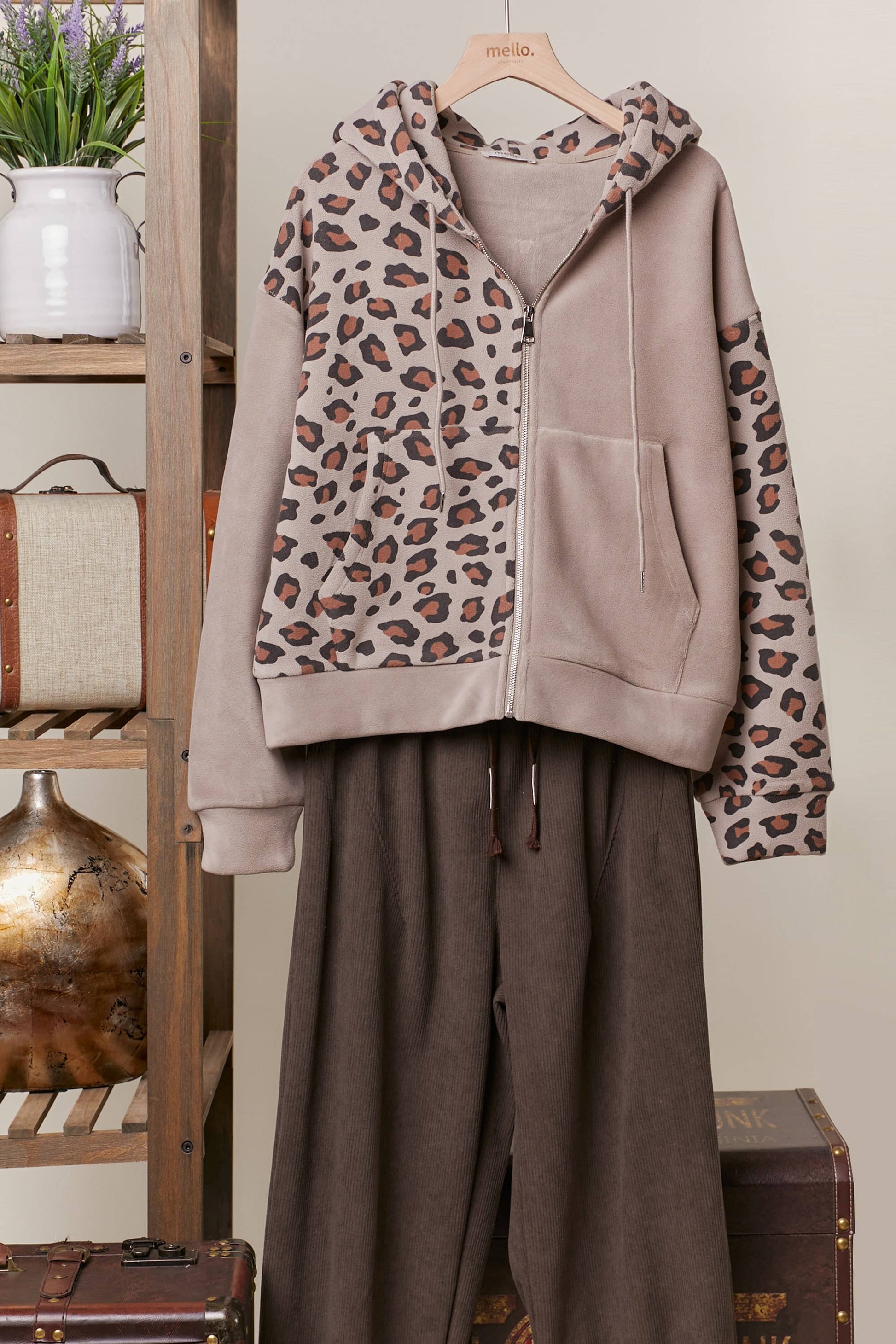 Zip Up hooded Sweatshirt with Leopard Print